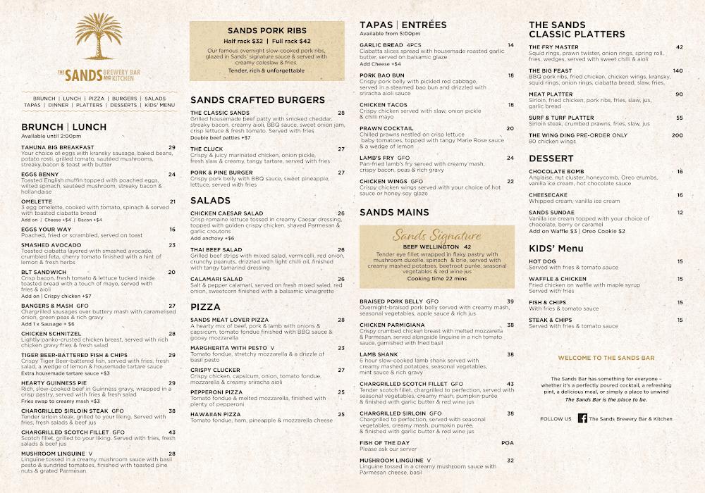 The menu at The Sands Brewery Bar & Kitchen is a carefully curated mix of classic comfort food and innovative dishes. You'll find options for everyone, from a substantial Tahuna Big Breakfast to lighter fare like the calamari salad. Burgers, including the beloved Classic Sands and Pork & Pine Burger, promise to satisfy hearty appetites. Pizzas, such as the Meat Lover and Hawaiian, make for excellent shareable plates. For those seeking small bites, the tapas menu features crowd-pleasers like shrimp twists and loaded fries. Seasonal specials often grace the menu, ensuring fresh ingredients are highlighted. Desserts and a dedicated kids' menu make The Sands a true family dining destination. Average prices hover around $26, providing gourmet experiences without breaking the bank.